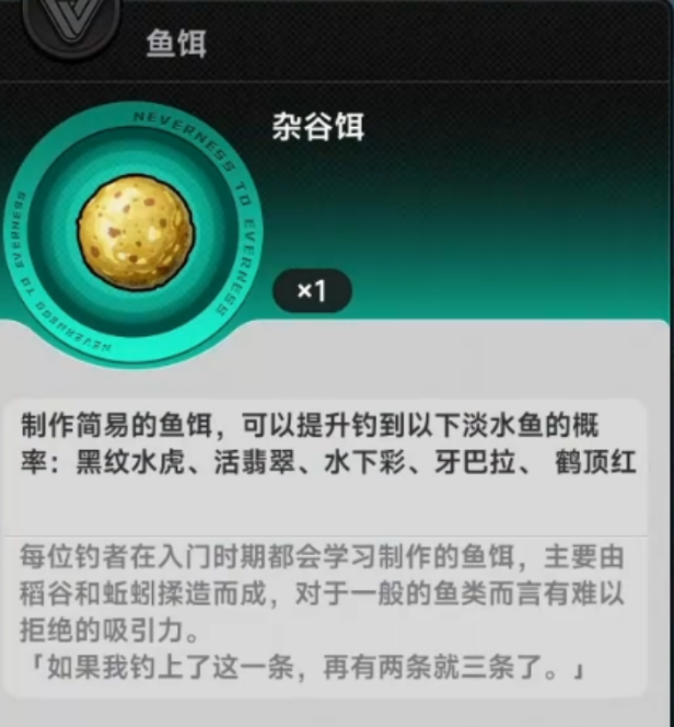 杂谷饵为进阶阶段淡水专项优化方案。以稻谷基质混合鲜活蚯蚓制成,制作流程简洁,成本可控。实测数据显示,该饵对黑纹水虎、活翡翠、水下彩、牙巴拉、鹤顶红五类淡水目标鱼具备明确吸引力,单位时间捕获率较新手鱼饵提升40%至65%。尤其适配主线推进中需高频采集淡水图鉴的任务节点,能显著压缩单次垂钓耗时,提升整体流程效率。