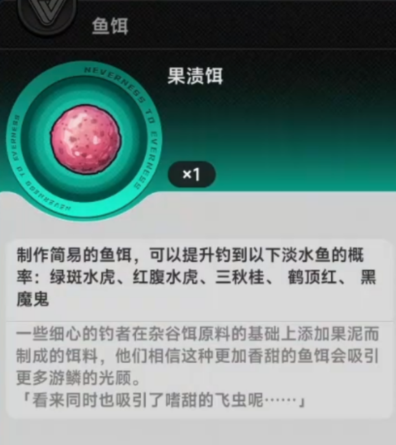 果渍饵是挑战稀有图鉴与限时水域活动的必备高级饵料。在基础配方中引入天然果泥发酵产物,强化气味分子扩散半径与持效时长,诱食窗口延长约20%。该饵对绿斑水虎、红腹水虎、三秋桂、鹤顶红、黑魔鬼等高稀有度目标形成定向覆盖。其中鹤顶红对杂谷饵与果渍饵均具响应,而黑魔鬼仅对果渍饵产生稳定咬钩行为——这意味着在攻坚黑魔鬼图鉴或参与“深渊潮汐”类限时事件时,果渍饵不可替代,直接决定任务成败。
