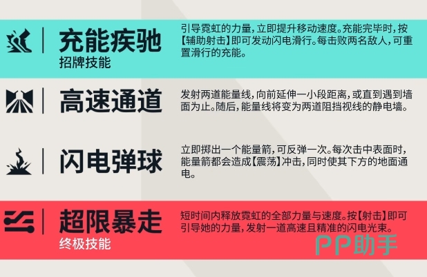 首先介绍霓虹的一技能——充能疾驰。激活后,她会进入充能状态,在能量蓄满时按下辅助射击键即可触发闪电滑行,实现短距离爆发式位移。这一机制让她成为全游戏中移动效率最高的角色之一。高速滑行配合精准枪法,使其在战场上的突袭与撤离都极具威胁,也正因如此,霓虹在视觉表现和操作手感上都深受玩家喜爱。