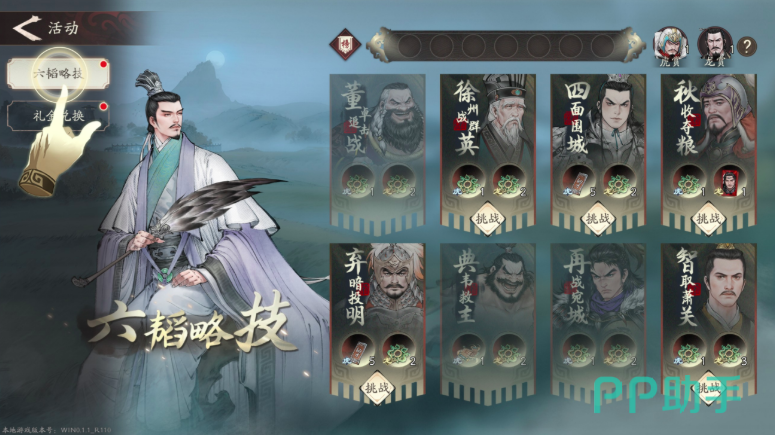 其实从大致整体玩法上来看,六韬略计和见真章,这两部分的玩法是极其相似的,不过对比难度来看,六韬略计的难度会更高,目前一共有8个关卡,每个关卡的具体难度差异各不相同,玩家在成功通关后累计4个虎,也包括龙在内,就可以获得于禁这个将领,累计获得6个龙评分就可以领取贾诩。而想要进入该游戏,可先点击右上角的活动按钮,然后就可以进入到六涛关卡,这8个关卡内容分别是董卓追击战,徐州战群英,四面围城,秋收夺梁,弃暗投明,典韦救主,再战宛城,智取萧关。