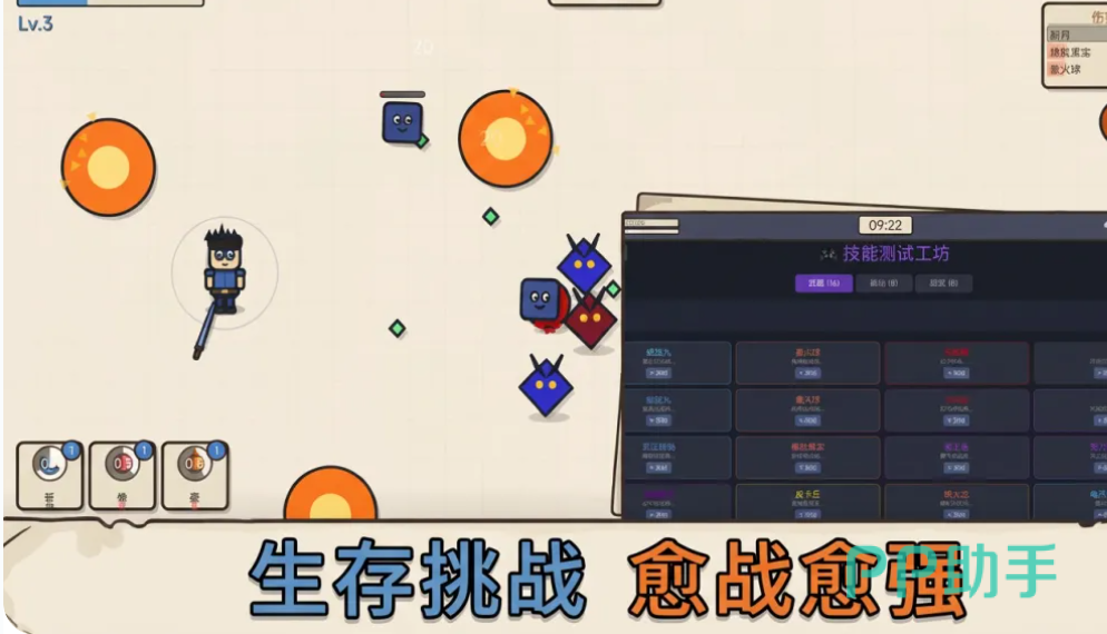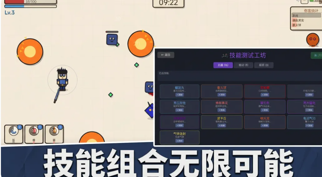 游戏核心玩法围绕技能成长展开:玩家初始可解锁旋风弹、火球术、弹射拳、斩月等共16个主动技能,每项技能具备独立攻击逻辑与效果表现。通过持续参与战斗积累经验,技能可逐级升级,触发形态进化与全新视觉特效。同时,8个被动强化技能与8类超级武器提供多维养成路径,玩家需依据当前遭遇的怪物类型或地图环境动态调整配置方案。