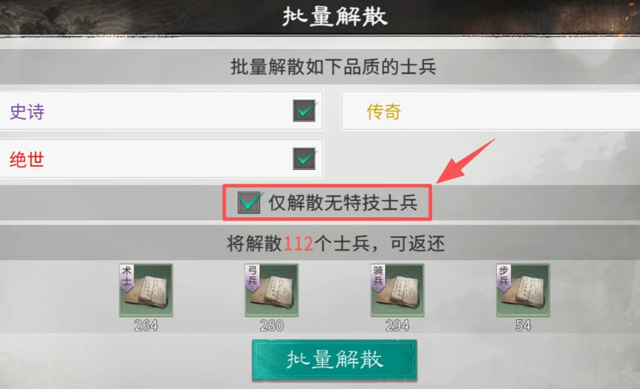 士兵等级与兵营等级严格同步,因此每日国家募兵所的征兵任务必须全额完成。征兵令应集中用于兵营升级,优先将兵营升至30级——这是所有后续兵种养成的前提条件。征兵过程中产生的冗余士兵,建议立即解散,且仅保留具备特技的单位。需明确:无论品质为绝世或传奇,无特技士兵的实际战场价值远低于有特技的传奇士兵;解散无特技单位可返还部分培养资源,实现资源高效回收。在培养优先级上,务必遵循“技能等级>能力强化”的顺序执行。