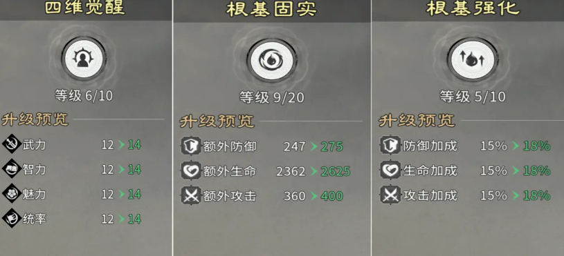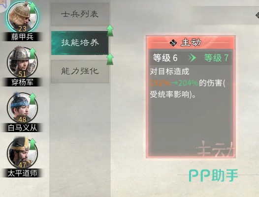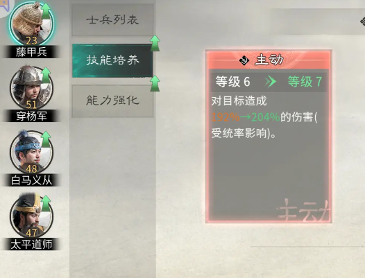 技能等级提升具有显著的线性战力增益。以穿杨军主动技能为例:从7级升至8级,基础伤害倍率由192%提升至204%;藤甲兵被动减伤效果亦随技能等级叠加生效。因此,主力兵种的全部技能应优先拉满。待核心技能达到上限后,再转入能力强化阶段。推荐强化顺序为:首点【思维觉醒】(直接提升综合属性,战力反馈最直观),次点【根基牢固】(每级固定增加防御值,投入产出比最优)。