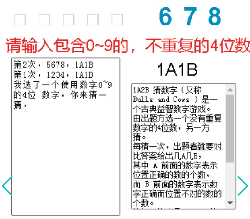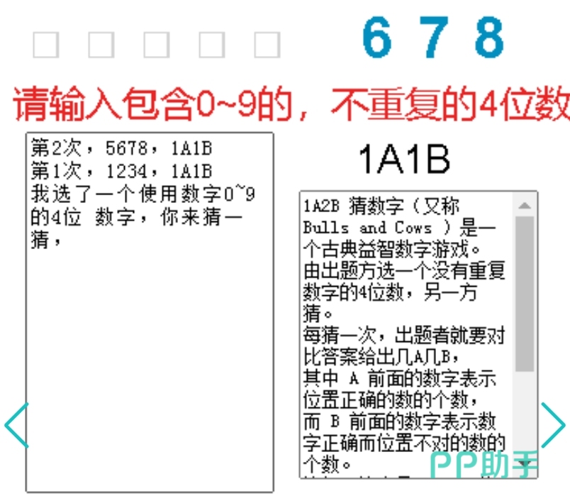 《数字猜猜谜》是一款非常经典的以猜数字为主要玩法的解谜小游戏。作为一款全程围绕数字展开的的游戏来说,这款游戏玩法简单但是想要玩好却不容易。其中蕴含的数学谜题很有难度,大部分都需要靠猜数。在游戏中,玩家可以通过输入对应的代码来选择游戏的难度,分为简单、一般、地狱三个模式。