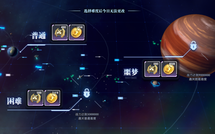 模拟战要求玩家单独保存一套阵容,首次进入时默认采用主线阵容,玩法中的对手皆为其他玩家,分为普通、困难、噩梦三个难度层级,每个难度均设置15关,玩家每日仅能选择一个难度发起挑战,选定后当天无法更改,每成功闯过一关,玩家便能收获相应奖励,每3关会出现一个宝箱,在通关宝箱前的关卡后即可开启,领取奖励后才能继续后续挑战,其中第15关后的大宝箱,内含更为丰厚的奖励,值得注意的是各难度存在战力门槛限制,普通难度无战力要求,困难难度需要玩家战力达到3000000且通关普通难度,噩梦难度则需战力达到9000000并通关困难难度。