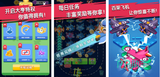 简洁的画面这里涵盖了多种多样的炫酷小飞机,就连操作方式都特别简单,玩家利用手指就能够完成飞行的任务,在飞行的线路当中,会沿途有大量的金币玩家可通过逐渐收集金币的方式,以此解锁更高等级的飞机。还将合成作为主要玩法,在两个相同等级的飞机中,通过滑动屏幕的方式就能合并成更高等级的飞机。