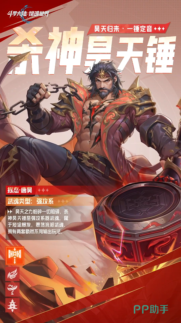 “杀神昊天锤”即拟态·唐昊,作为近期上线的新武魂,在玩家群体中引发了高度关注。由于其原型唐昊在原著中拥有极强的战斗力与威慑力,因此该武魂上线后便备受期待。本文将详细解读杀神昊天锤的各项技能机制,帮助大家全面了解这一强力战斗形态。