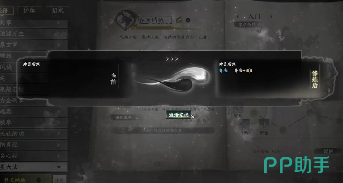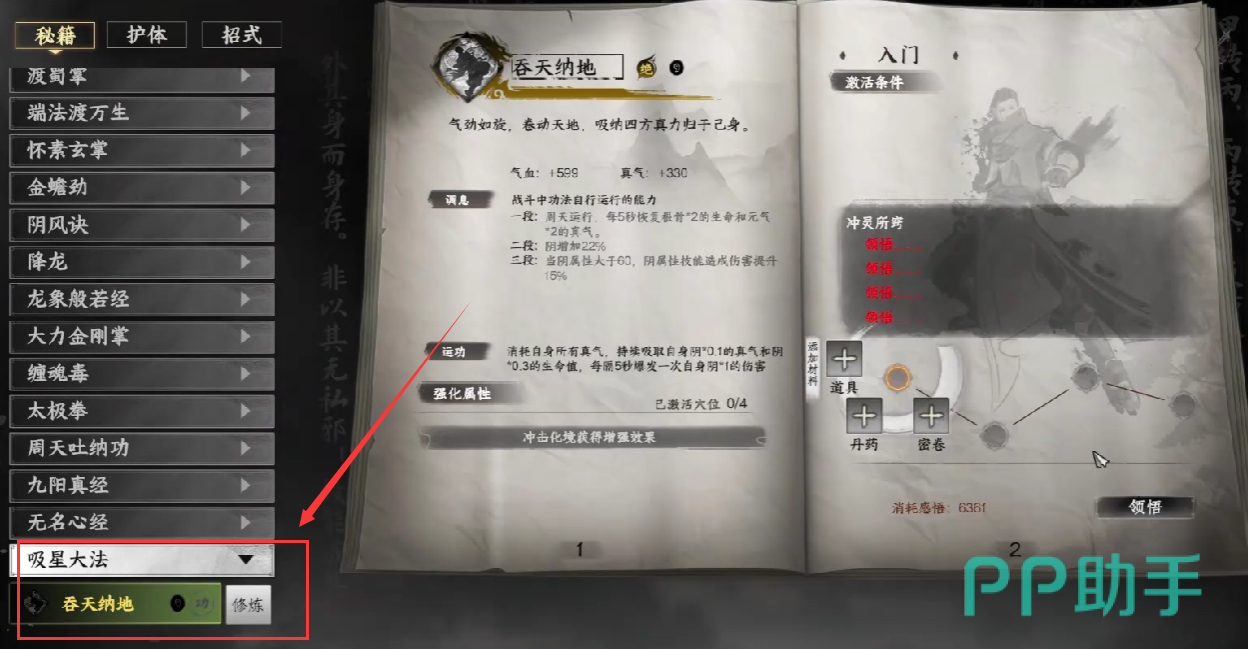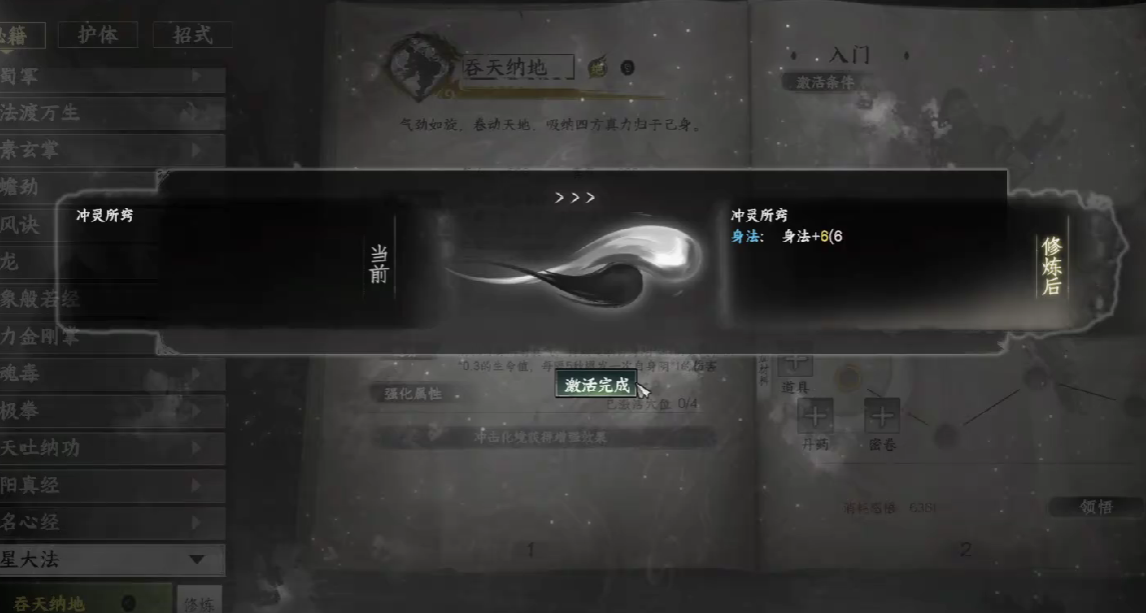 在搭配武学方面,建议配合拳法或长剑类招式使用吞天纳地,避免选择依赖真气释放技能的流派,以免因真气被完全消耗而影响整体输出节奏。同时,为最大化心法效益,应优先提升角色的阴属性,从而提高恢复效率与伤害输出。