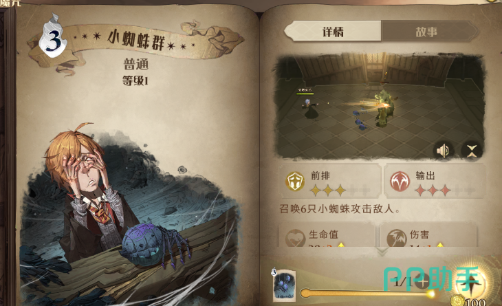 【小蜘蛛群】新手类的技能,在新人入学阶段获得的第一个咒术,在释放的时候,是可以在自身附近召唤出六个蜘蛛,蜘蛛可以当做半个前排和输出来使用,毕竟人多力量大!而且这个技能升级过后,伤害会变得更加的高,前期没有咒术可以使用时,推荐选择升级此咒术!