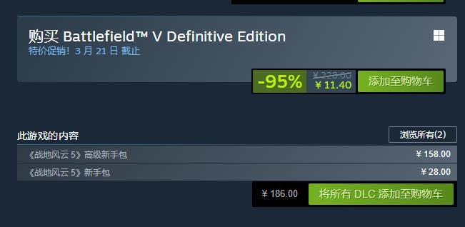 战地系列在此次的促销阶段会刷新较低的价格。战地五会打0.5折,直接11.4元,这价格基本不用考虑,直接入手就完事了,毕竟这也是当年的一款3A射击大作,10几块的价格,入手不会亏。