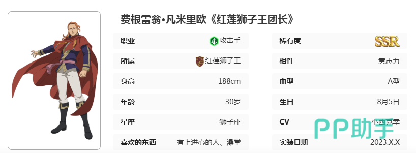 身为稀有度达到SSR的主力输出,法格莱恩在战斗中展现出了顶级水准的实力表现。他从不因出身而轻视他人,反而格外欣赏那些拥有奋斗精神的同伴。尽管外表刚毅如狮,但在团队之中却也流露出细腻的一面,尤其是对弟弟无微不至的关怀,使他的角色形象更加立体且富有感染力。生日为8月5日的他正对应着狮子座的性格特质——自信、果敢,而在日常生活中,泡澡堂成了他放松身心的独特方式,也为这位强者增添了几分生活气息。