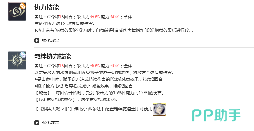 必杀技“大火炎狮子的咆哮”则专注于单体打击,威力惊人。当目标带有持续伤害状态时,伤害增幅可达40%,同时施加持续两回合的烧伤效果。此外,协力技能可在对抗带有检疫状态的敌人时,冷却15回合后触发,提供30%的伤害增益;觉醒后的被动技能则进一步强化输出效率——每攻击一名附带持续伤害的单位,即可叠加3.5%的额外伤害,形成越战越强的战斗节奏。