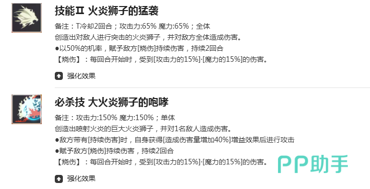 群体技“火炎狮子的猛袭”具备覆盖全体敌人的能力,造成65%的魔力与攻击力混合伤害,并有50%概率附加烧伤效果,令对手在后续回合持续受到伤害。配合专属被动机制,释放该技能时还能额外施加一次烧伤状态,显著提升控场与消耗能力。