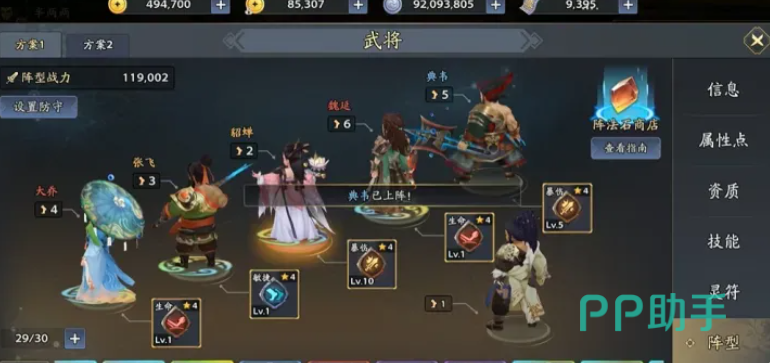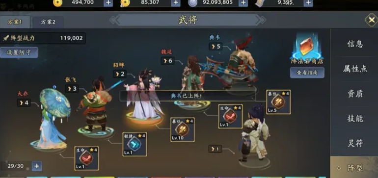 魏延负责中后排AOE输出,并为典韦提供增益类BUFF;典韦则作为物理系前排,拥有高生存阈值与稳定承伤表现。主角建议选择扇子或画卷职业,强化控制链完整性与战术衔接性。整套配置覆盖治疗、解控、群攻、抗压、控场五大维度,无明显短板,适合新手过渡至中期养成阶段。