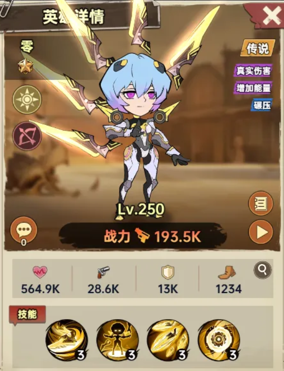 【刀锋之舞】为零的核心输出技能:可对两名随机敌方单位造成408%攻击力的伤害,并附加相当于目标当前已损失生命值25%的额外真实伤害(上限为零自身攻击力的1200%)。当敌方单位生命值高于零自身最大生命值时,该技能100%触发持续两回合的眩晕效果,显著提升其在高难度BOSS战中的战术地位。