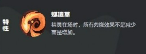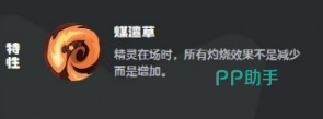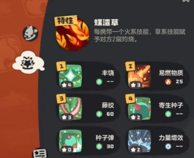 其特性“煤渣草”是整套体系运转的核心引擎:当技能栏中至少存在一个火系技能时,任意草系技能命中目标后,均可额外施加2层灼烧效果。该机制极大提升了灼烧叠层效率,也决定了技能配置的基本范式——通常携带1个火系技能作为触发媒介,其余3个技能全部选用草系,以实现高频、稳定的层数积累。