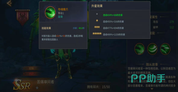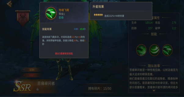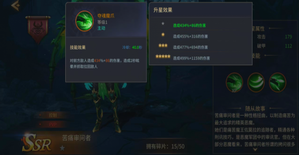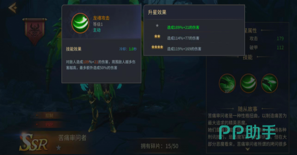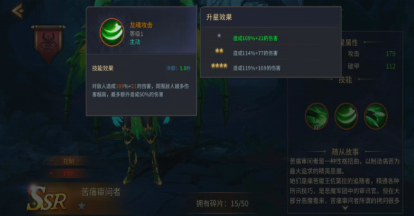 技能设计深度呼应“刑讯压制”主题。一技能【龙魂攻击】拥有仅1秒的冷却时间,基础伤害为109%+21,且具备动态增伤机制:每增加一名周围敌人,伤害提升10%,最高叠加5层,额外增伤达50%。该特性使其在应对低阶杂兵群时清场效率极为突出,可快速清理干扰单位,为主力输出腾出安全环境与目标聚焦空间,是PVE常规推进阶段的关键辅助手段。