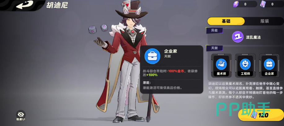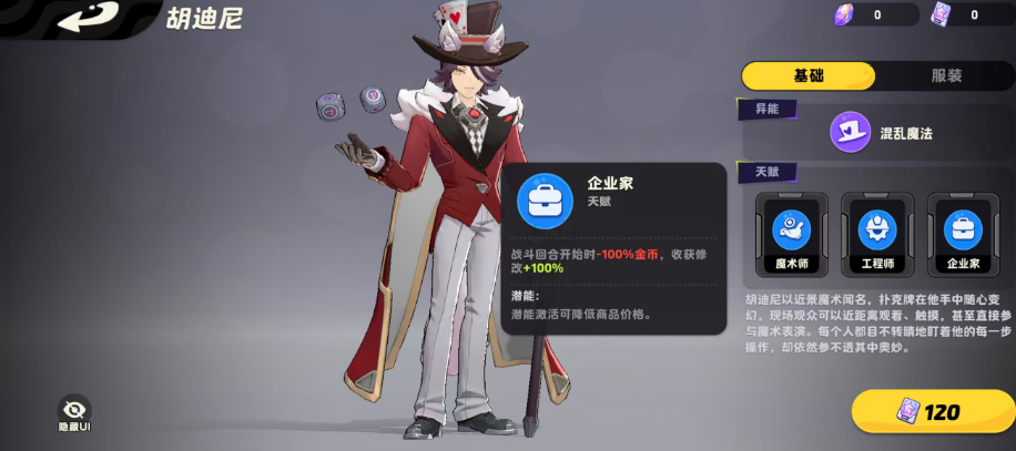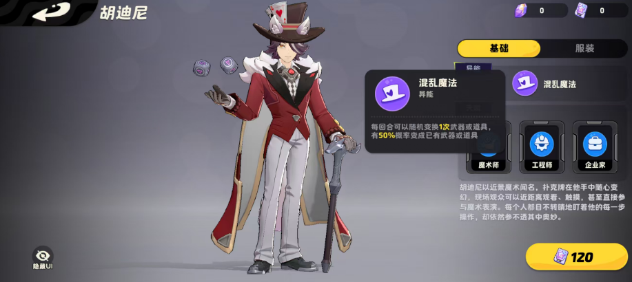 胡迪尼的核心异能为“混乱魔法”,该能力可在每回合主动触发一次,允许玩家随机重置当前持有的武器或道具。值得注意的是:每次重置有50%基础概率生成自身已拥有的同品质装备或消耗品。这一机制不依赖金币投入,却显著提升同类道具的获取密度——当玩家持有两把相同品质的武器时,即可立即启动合成流程,相较常规商店刷新节奏,同类武器合成效率提升超过100%。