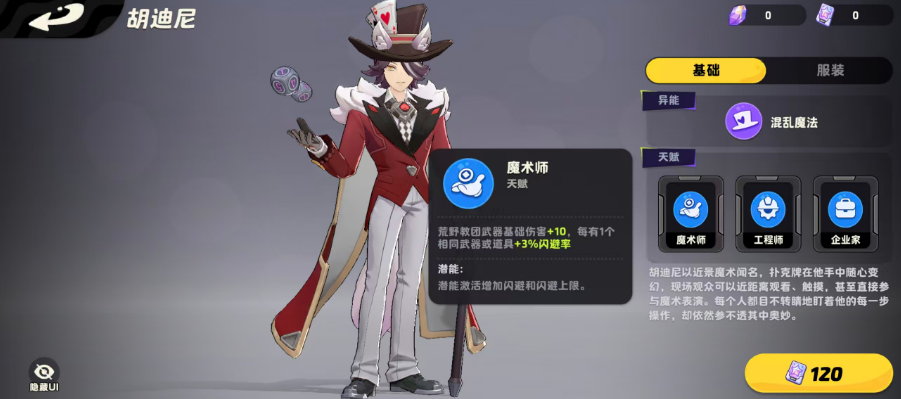 在天赋系统层面,胡迪尼提供三条差异化成长路线。“魔法师”天赋为其赋予荒野教团武器专属加成:使用该阵营武器时,基础伤害固定+10点;同时,场上每存在1件相同武器或道具,闪避率提升3%;激活对应潜能后,闪避基础值与上限同步获得额外增幅。该天赋明确指向荒野教团武器生态,推荐优先锁定弹弓、原始流星锤、荒野狼牙棒及闪电魔杖等核心装备。