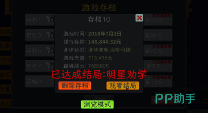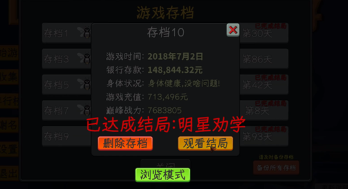 游戏中设置了多种结局分支,每一条故事线都由玩家在关键节点所做的决定所驱动。若想解锁“明星劝学结局”,必须走一条极端的氪金路线。具体而言,玩家需要在游戏中持续为虚拟网游充值,为此不惜变卖所有家产和交通工具,并向亲友借贷资金,将全部所得投入游戏消费。当完成这一系列操作后,便可进入核心玩法——城主战的挑战环节。值得注意的是,只有在城主战讨伐失败的情况下,才会激活“明星劝学结局”的剧情动画,随后游戏结束,玩家可重新开始以探索其他结局路径。