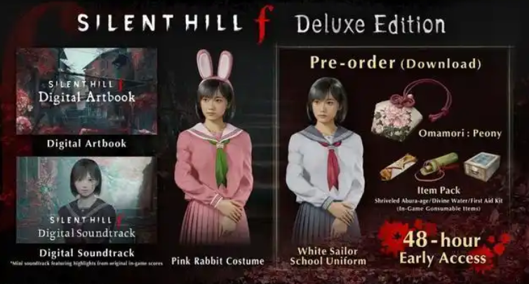 根据Steam平台显示,寂静岭f的标准版售价为391元,豪华版为446元。预购玩家将获得白色水手服、护身符牡丹以及道具包,其中包含干瘪油豆腐、御神水和急救箱等实用物品。豪华版则在包含所有预购奖励的基础上,额外提供数字美术设定集、原声音乐集、粉色兔子服,并享有提前两天进入游戏的特权。从性价比角度来看,豪华版相较于标准版仅高出有限金额,内容却更加丰富。
