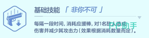 固有技能「非你不可」为周期性单体攻击技,消耗应援棒发动,造成伤害并降低目标攻击力。技能强度与所消耗应援棒数量呈正相关,因此合理规划应援棒积累节奏(如配合队友技能联动),是释放该技能最优效能的核心前提。