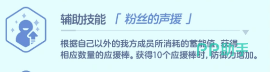 辅助技能「粉丝的声援」构成美祢战术循环的关键一环:每当其他角色消耗蓄能值,美祢即获得等量应援棒;累计达10根时,额外提升自身防御力。该机制使其与高频使用蓄能技的角色(如部分支援型或爆发型角色)形成天然协同,队伍活跃度越高,美祢的坦度成长越显著。