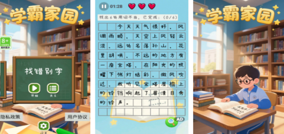 这款有趣的文字修正类游戏,锻炼你的毅力,以及耐力和具体的观察能力。每个关卡当中都会给予一篇相应的文章,有的是普通的作文,有的是优秀的日记。看似这些文章比较正常,但真正探索之后就会发现其中包含很多错别字,甚至也有很多病句,小伙伴们需要找出来并修改,这样才能够完成关卡,此游戏专为学习爱好者所打造,有机会从学渣逆袭成为学霸。
