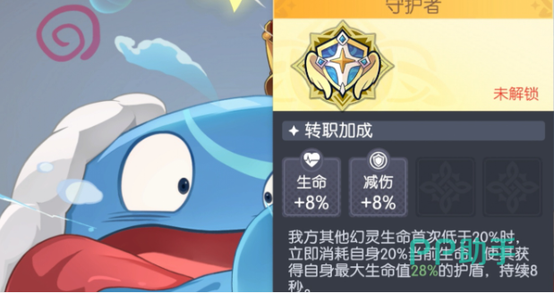 守护者:侧重生存支援与临界反制能力。适配对象包括雅典娜、奥伯隆妮等以保护后排为首要职能的坦克角色。转职后可获得8%最大生命值加成与8%全伤害减免;当己方任意幻灵首次生命值跌至20%以下时,自动消耗自身20%当前生命,为其生成相当于28%最大生命值的护盾。该机制具备强时效性与容错价值,在射手或法师阵容中尤为关键,能有效拦截敌方爆发斩杀,显著提升团战续战能力。