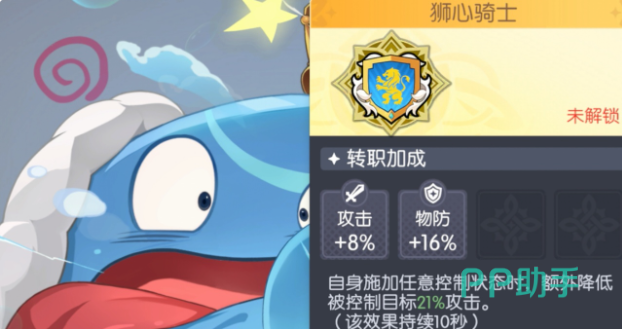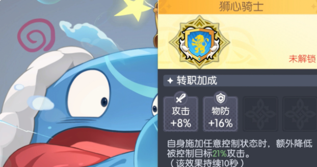 狮心骑士:专为具备控制技能的坦克设计。典型适用角色有史莱姆国王、海尔曼等。转职后提供8%攻击力与16%物理防御提升;每当自身施加任何控制效果(如眩晕、冰冻、沉默等)时,额外降低目标21%攻击力,持续至控制结束。该效果可随控制技能重复触发并叠加,形成对敌方主力输出的持续压制。需注意:无稳定控制手段的角色选择此转职将无法激活核心被动,导致资源浪费,务必结合角色技能组判断适配性。