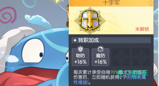 十字军:泛用型抗压向转职,适用于多数基础坦克角色。提供16%物理防御与16%魔法防御双重增益;每累计承受等同于自身70%最大生命值的总伤害后,立即激活两项防御强化效果。该机制强调“越战越稳”的成长逻辑,使坦克在持续承伤过程中逐步提升坦度,契合持久战、多段AOE环境及缺乏明确功能定位的常规阵容。在无特殊战术需求时,十字军是最稳妥、兼容性最强的基础选择。