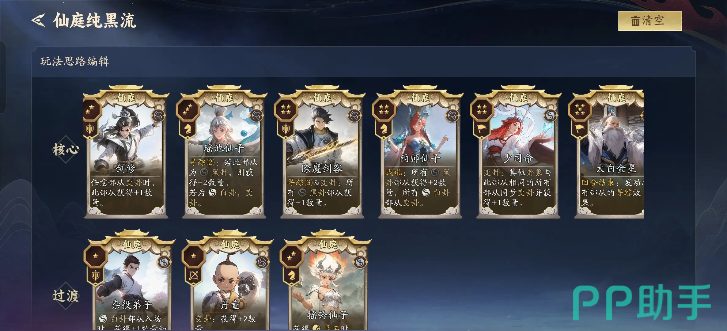 综上,两仪流与纯黑流是当前仙庭阵营中完成度最高、实战反馈最优的两种构筑方向。二者均对核心卡牌培养要求明确、成型路径清晰,且不依赖极端稀有资源即可达成可观战力表现。无论偏好稳扎稳打的属性叠加,还是倾向快节奏的动态刷卦压制,这两套方案均能提供扎实的战术支撑与较高的竞技上限。