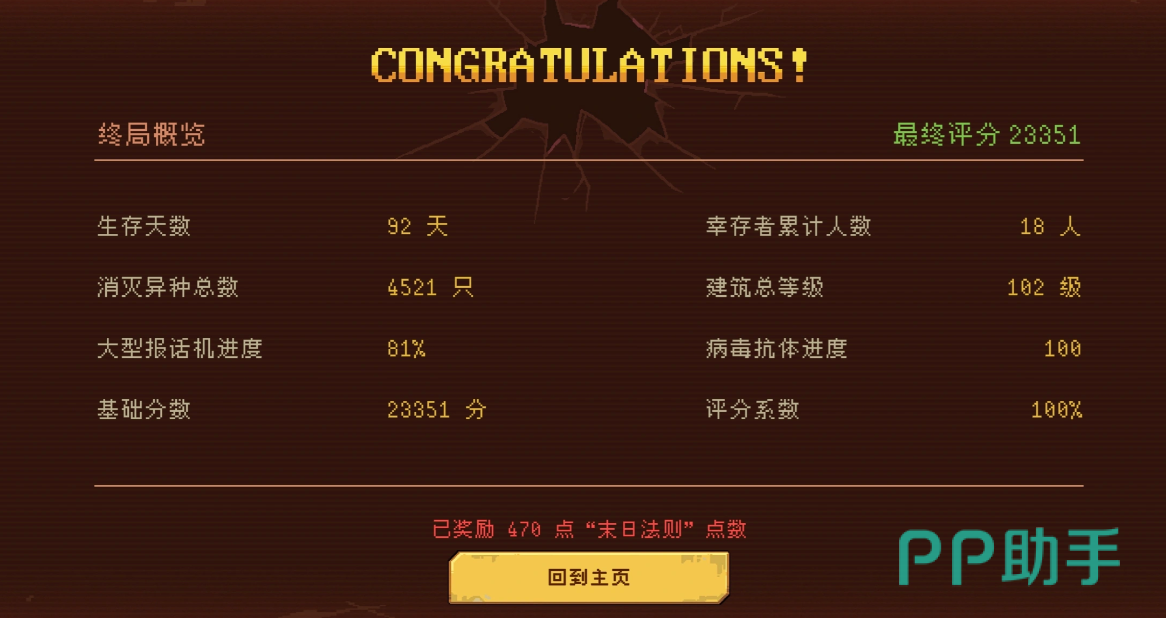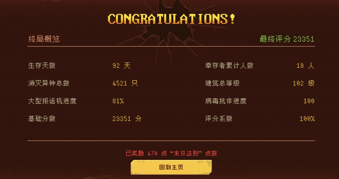评分系统是驱动长期目标的核心机制之一。最终结算分数主要由两项指标构成:消灭僵尸总数与当前库存物资总量,二者权重最高;抗体研发等级与建筑综合等级则作为辅助加成项参与计算。高分段对应更丰厚的赛季奖励与稀有资源返还,形成正向循环激励。