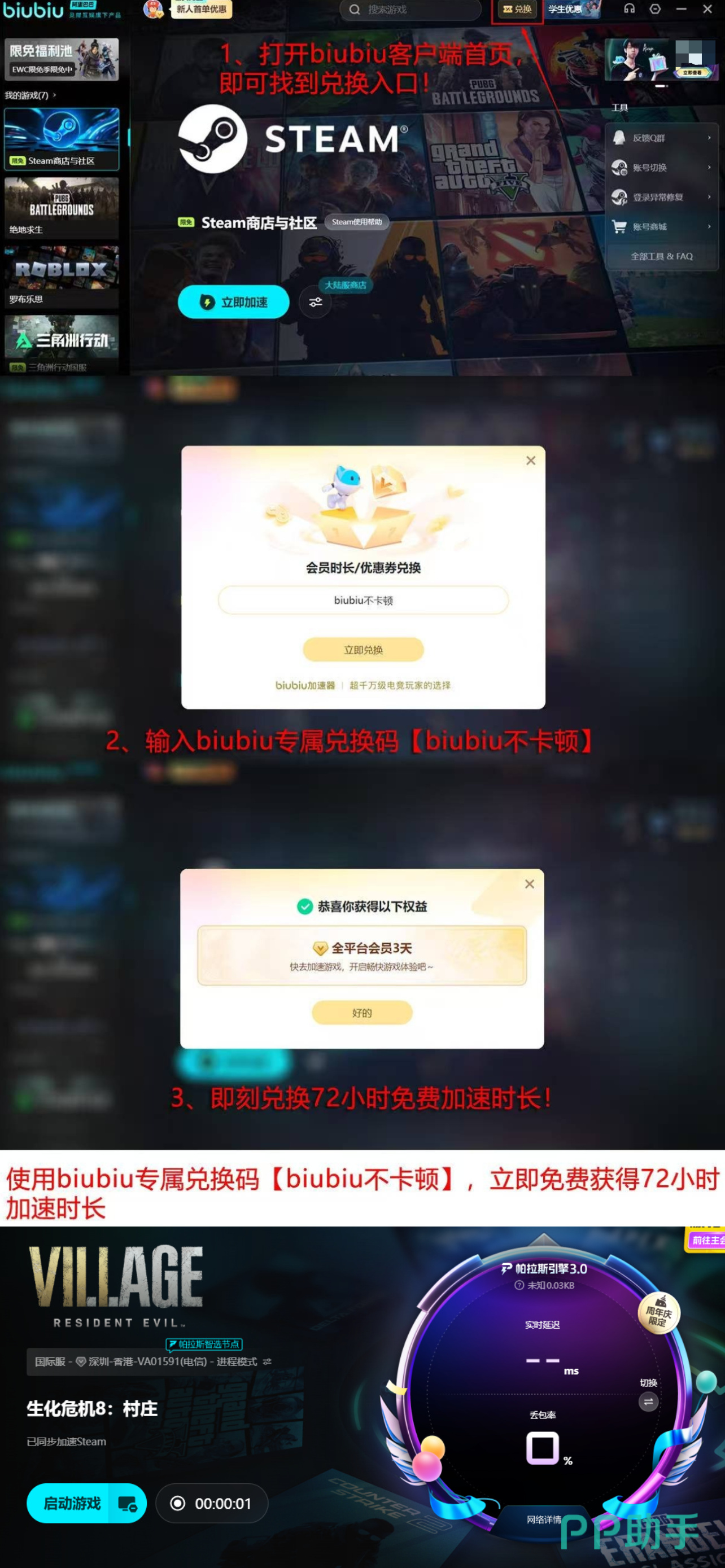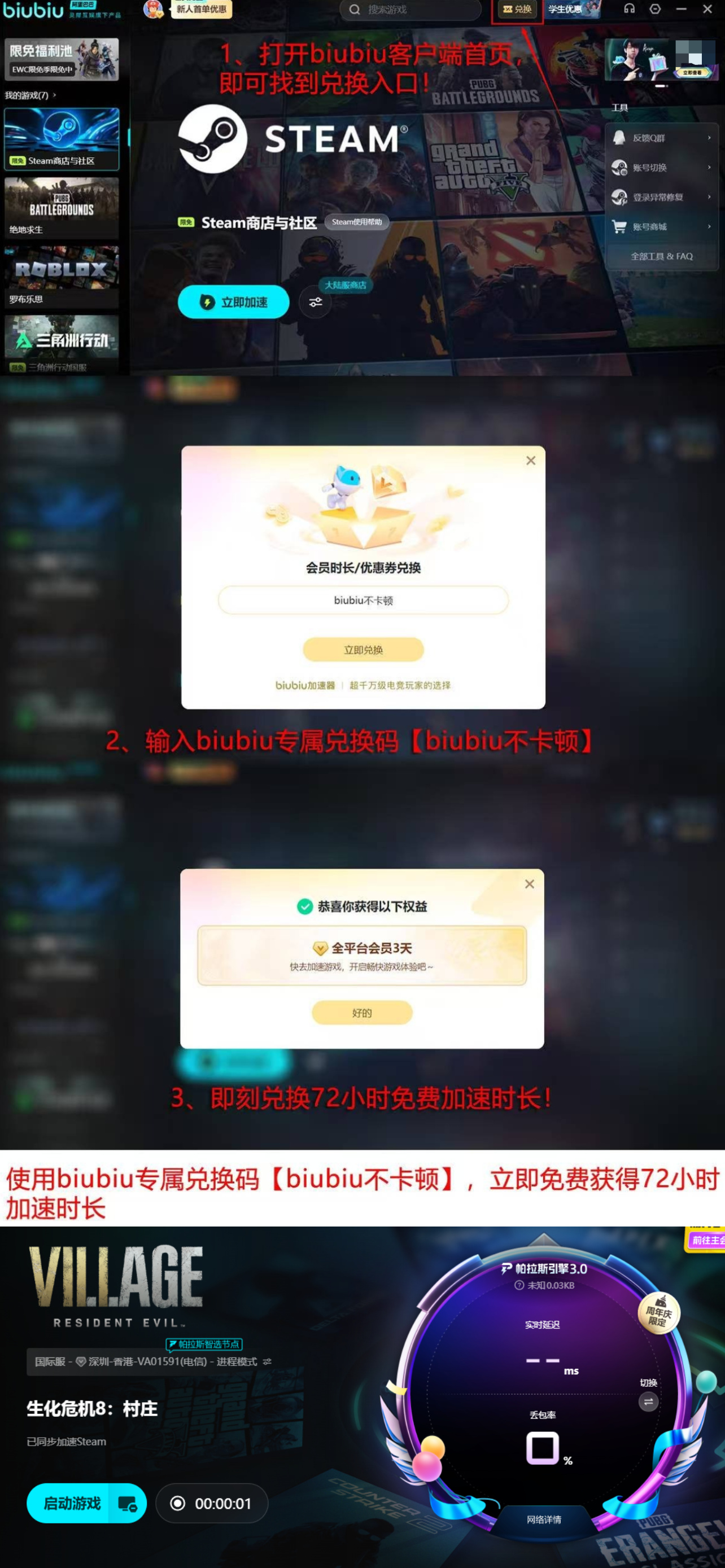 新注册用户首次登录即可自动获得1日免费提速权益;如需延长体验周期,平台同步开放面向全体用户的3日提速福利,输入口令码【biubiu不卡顿】即可即时领取。