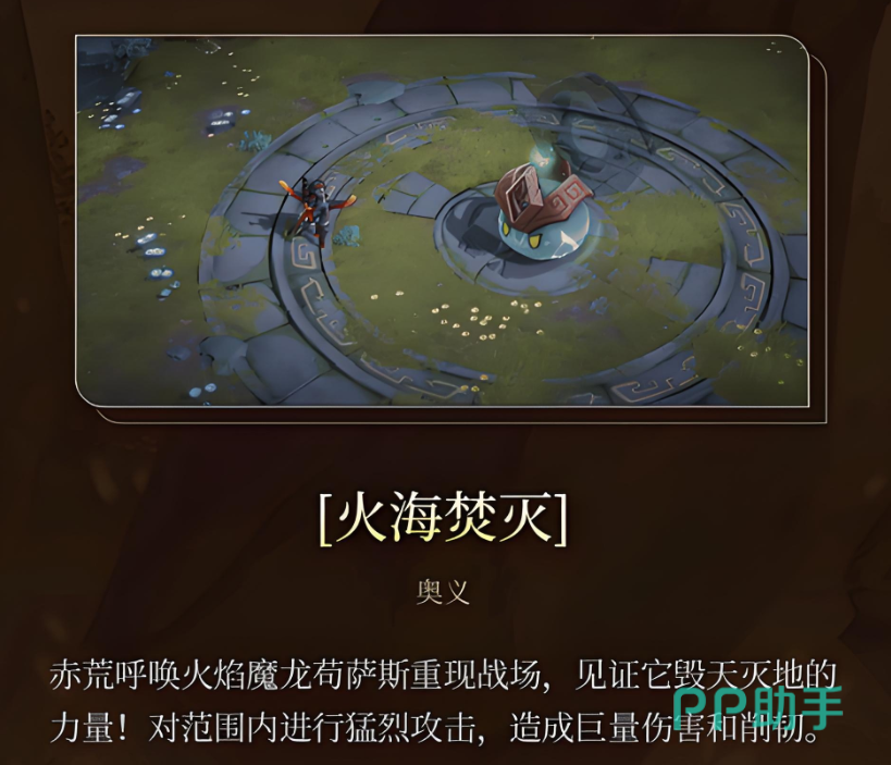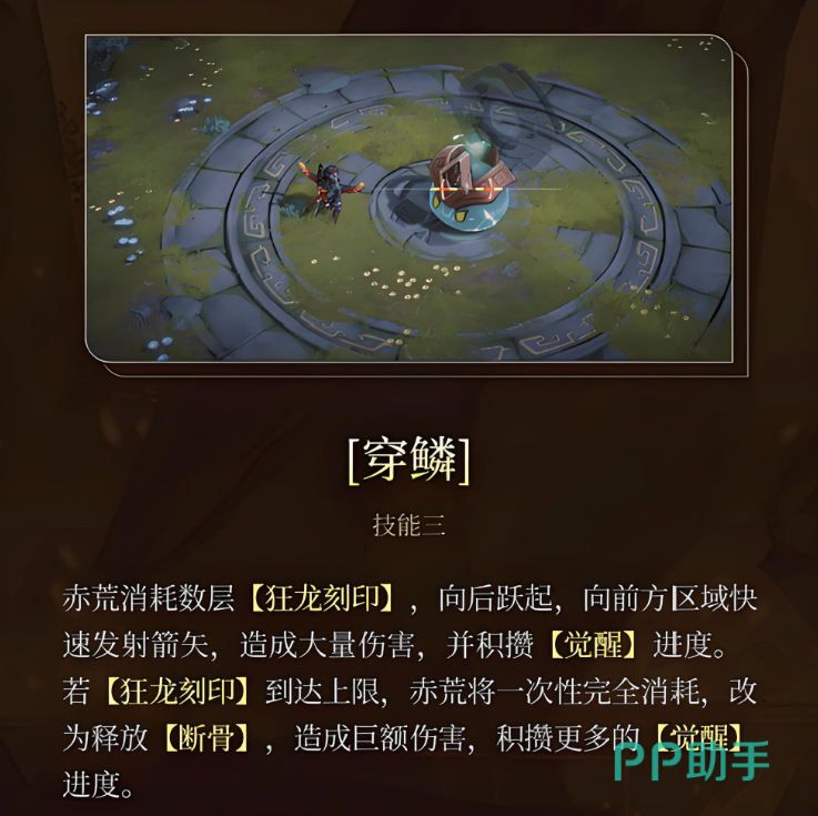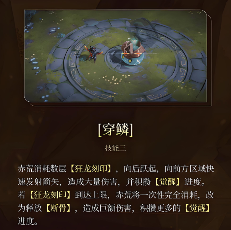 只有在合理的阵容支撑下,赤荒才能充分发挥其作为火系顶级输出的潜力。其标准输出流程如下:开局通过普攻积累觉醒值并叠加狂龙刻印,接着使用一技能“盛怒凌空”命中破绽获取额外刻印,启动输出循环;紧接着释放二技能“巴鲁姆克”进行三段斩击进一步叠加印记,并为三技能“穿鳞”或强化版“断骨”创造爆发条件;最终根据战场形势决定是否释放奥义技“火海焚灭”完成范围清场与收割。
