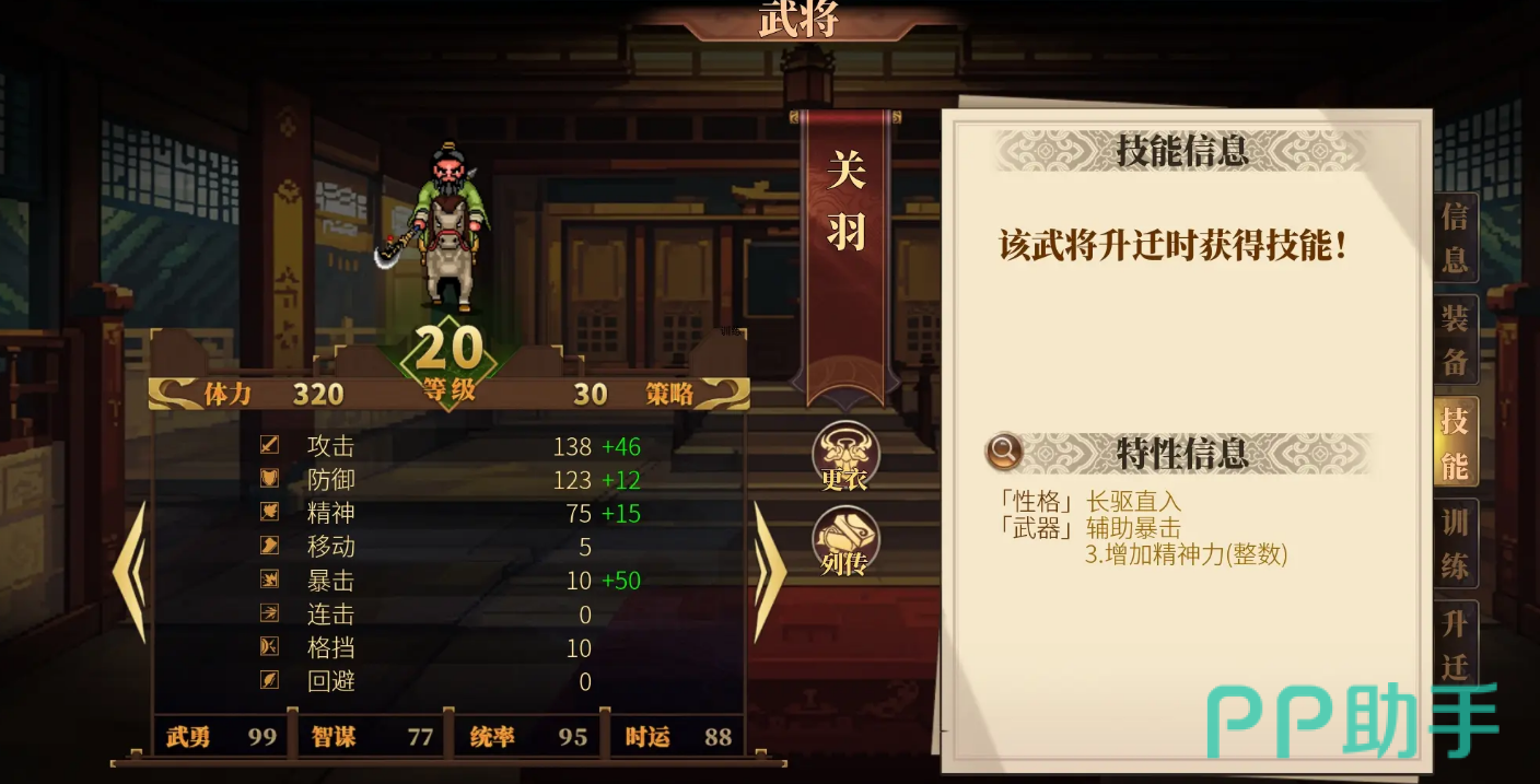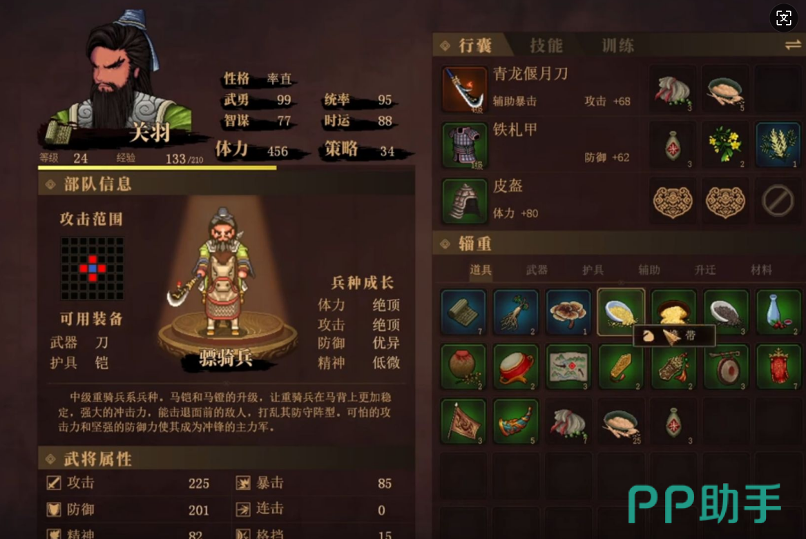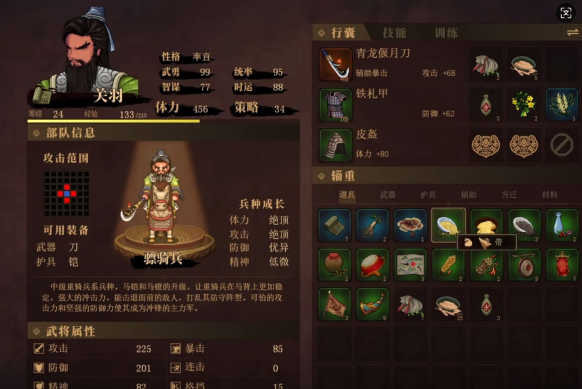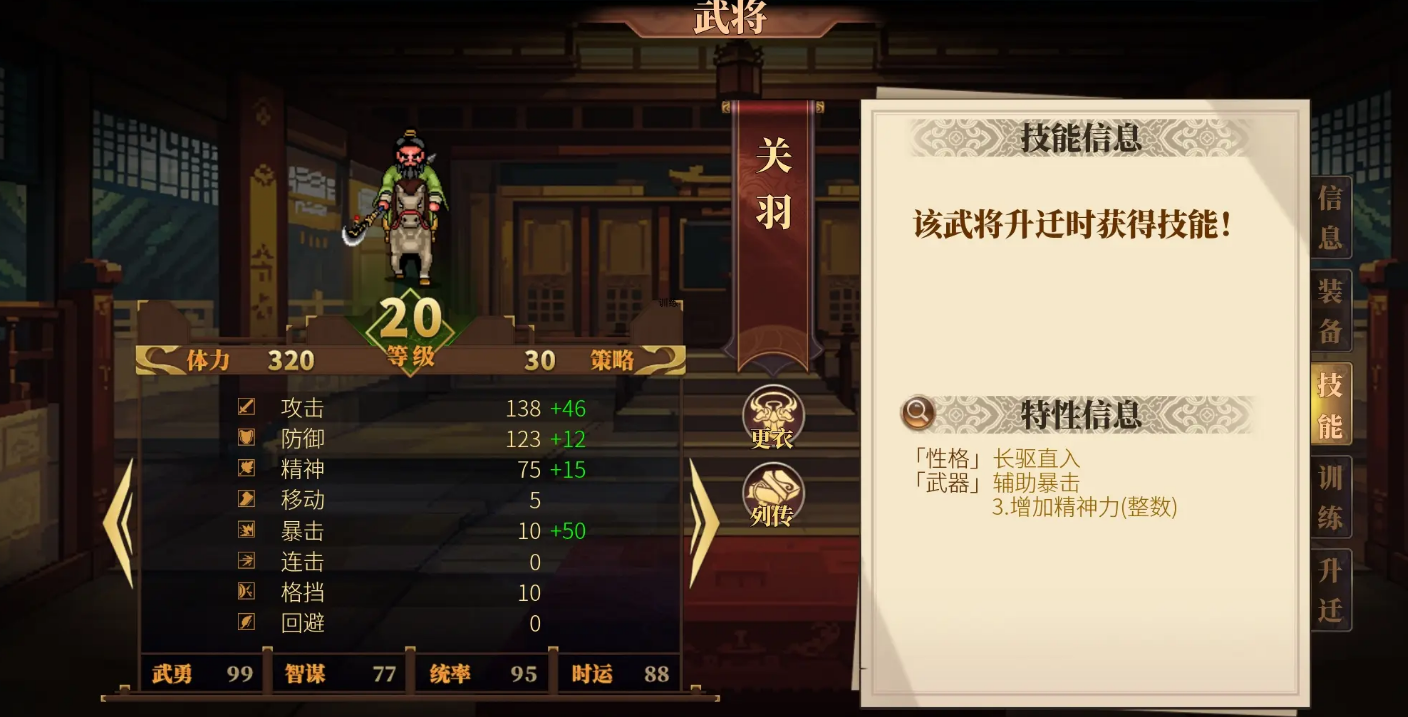关羽在该游戏中作为勇将,前期使用重骑兵,转职之后,他的攻击力暴击伤害以及暴击几率都会得到有效的提升,能够强化他的爆发输出能力,可以在战场上变得越发的强大。而关羽的标志性武器青龙刀满级,暴击伤害直接增加到150%,暴击的几率也能够达到30%以上。