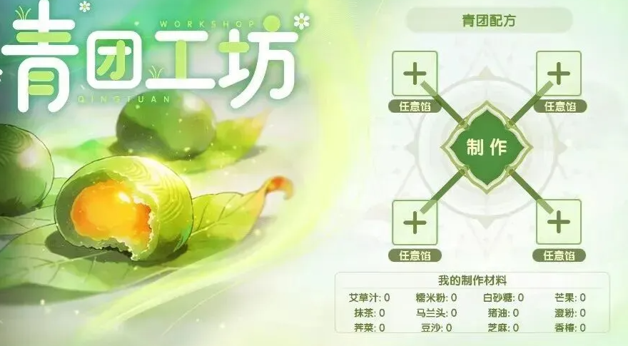 【青团工坊】主打收集合成玩法。玩家需在活动地图中采集糯米、艾草、豆沙等基础材料,按配方比例合成青团;开启成品青团后,可随机获得陨铁星辉、黄金宝箱、钻石宝箱等稀有成长资源,合成成功率100%,无材料损耗风险。