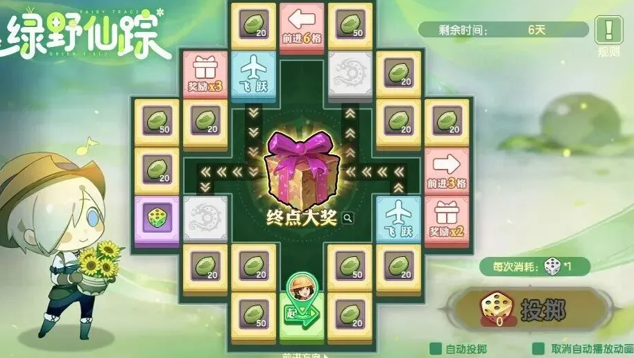 【绿野仙踪】为掷骰行进类积分玩法。玩家使用任务获取的踏青骰子,在棋盘上前进并停驻于不同格子:普通格奖励随机数量踏青积分;特殊格触发额外事件,如双倍积分、跳格或即时道具掉落;抵达终点可一次性领取200点踏青积分,用于后续兑换专属奖励。