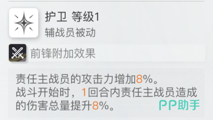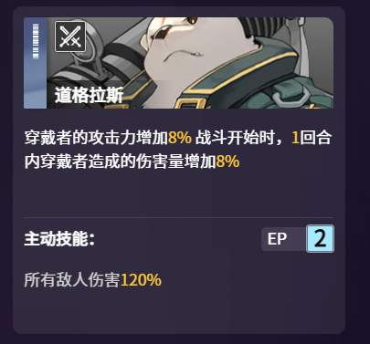 道格拉斯拥有被动技【护卫】与主动技【巨型火箭筒】。被动技提供双重增益:一是使自身获得8%攻击力加成;二是在每场战斗开始时,提升责任主战员全回合总伤害8%。该效果无需触发条件,稳定生效,属全局型基础增幅。主动技消耗2点EP释放,可使责任主战员当回合对全体敌人造成的伤害提升120%。需注意:该增幅作用于主战员全部攻击行为,包括多段伤害、持续伤害(DoT)及连锁反应,具备显著的AOE强化能力,适用于清杂兵或Boss战关键轮次爆发。