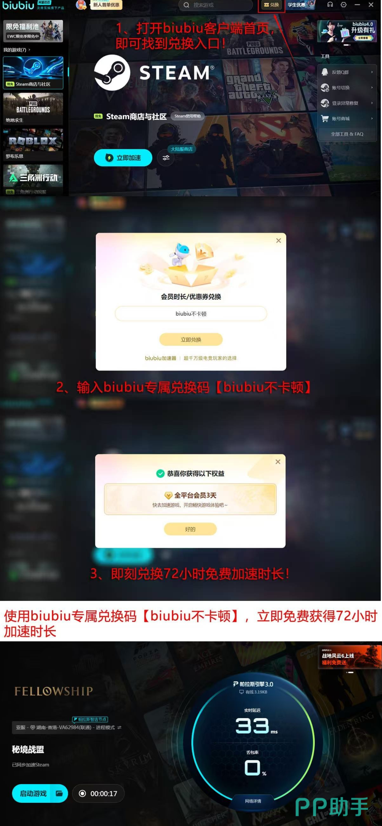 即便是首次使用的用户也无需担忧,平台准备了多项新手福利。新用户注册登录后即可领取一整天免费提速服务,同时所有玩家还可通过指定方式兑换三天体验时长,只需在活动区域输入【biubiu不卡顿】即可获取。