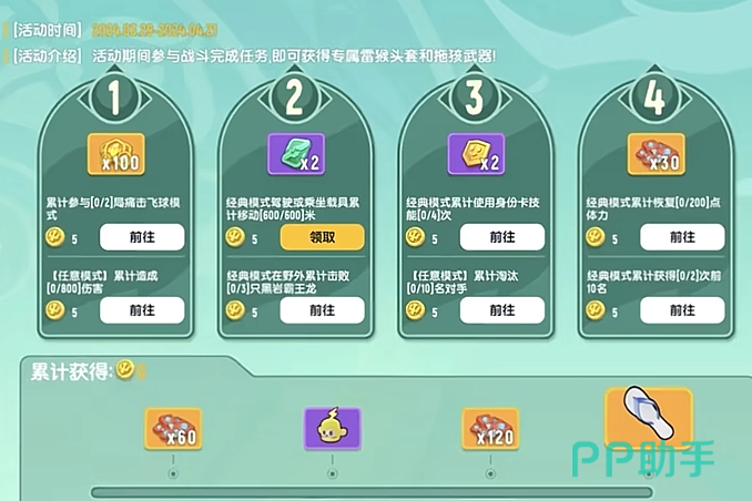 活动中的任务也比较简单,玩家们需要根据任务的开放时间,去完成两个不同个的任务,完成后可以获得点数,当玩家们点数达到35的时候,就可以获得金色的皮肤奖励【马桶搋】了!