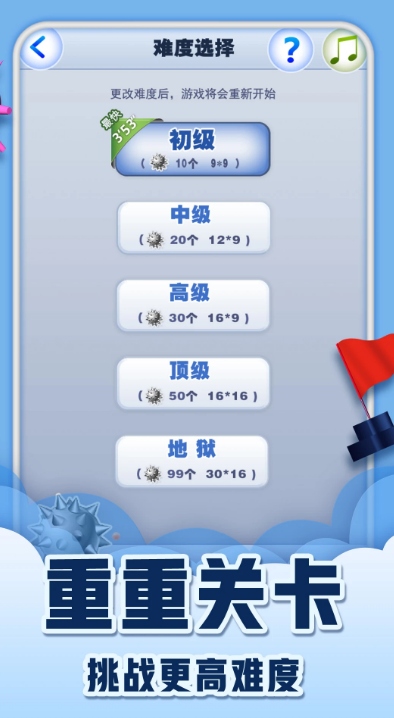 每个方块都拥有各自独特的状态表现,当大家点击某些方块时,屏幕上会浮现出一个数字,这个数字可不是随便出现的,它是在向大家透露周围八个方块里藏着多少个危险因素呢,大家得依据这个数字去琢磨哪些方块是能放心踏足的,哪些又暗藏危机。还有些方块,一旦点击就会引发爆炸,宣告大家的挑战失败,所以每一步都得小心翼翼。这游戏设有多种难度,从易到难,逐步掌握规则与技巧。