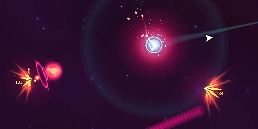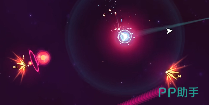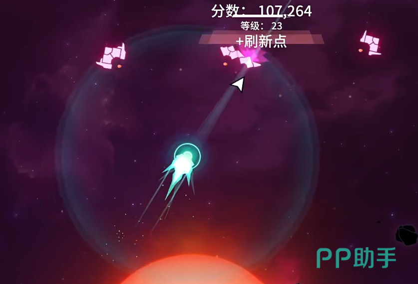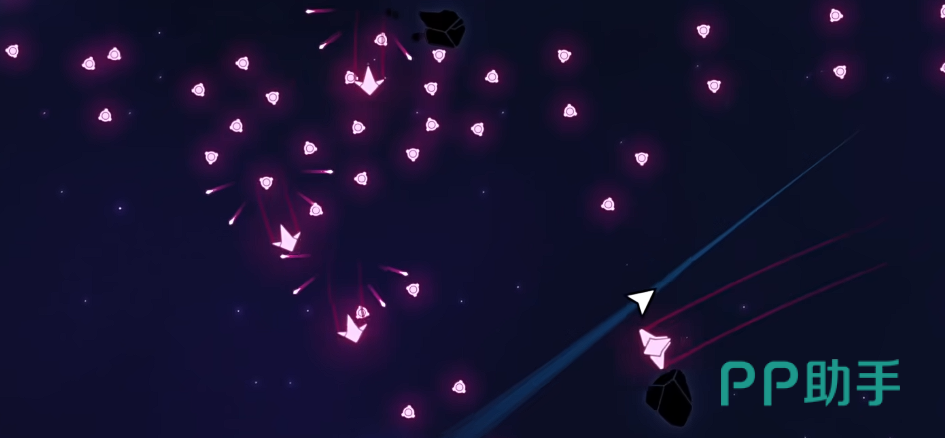 视觉层面采用高对比度色光体系:玩家操控的飞船以动态光晕为核心视觉锚点,敌方单位则统一设计为几何化巨型陨石体,通过饱和度差异区分威胁等级。虽整体造型趋于简约,但蓝紫主调与橙红预警光效的碰撞,辅以粒子拖尾与爆炸光晕的逐帧优化,营造出沉浸式太空交战氛围。