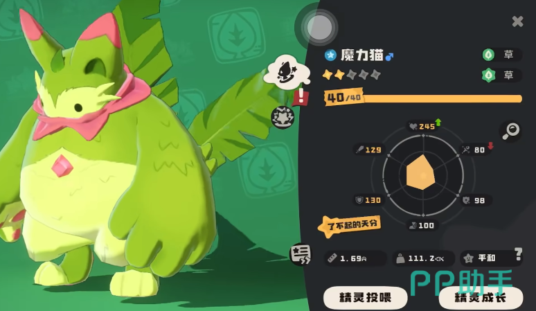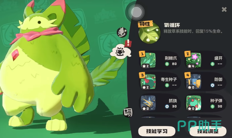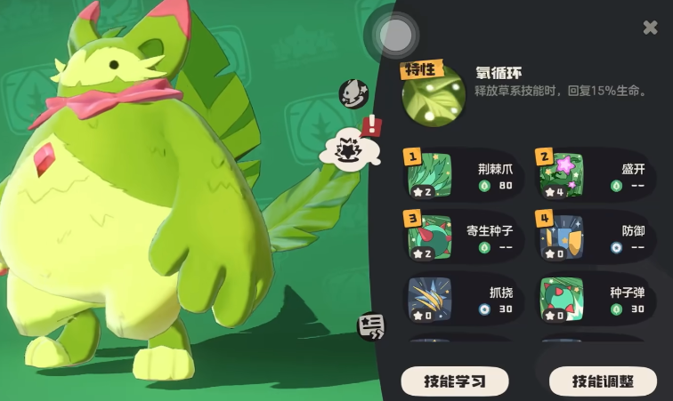 魔力猫是喵喵的进化体,这是一个草系精灵,相对来说各属性是比较均衡的,不只适合生存,同时角色非常适合消耗战,就是因为角色的特性是可以在释放技能的时候,恢复15%的生命值,非常适合新手去使用,使用这个角色可以用寄生种子、光合作用,藤绞,这几种技能组合起来,使用寄生种子之后,就可以在每回合吸血8%,藤绞主要的作用是在对战的过程中不断积累能量,光合作用可以维护角色的血量,这几个技能组合起来,就可以让角色的血量不断提升。