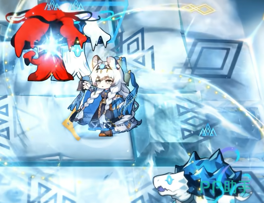 她的第一项天赋表现为:攻击范围内的地面会周期性生成积雪区域,任何经过该区域的地面敌人将承受基于其攻击力一定比例的法术伤害。此外,每层积雪都会叠加降低敌人的移动速度,形成持续性的减速场域,具有良好的控场效果。