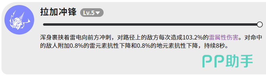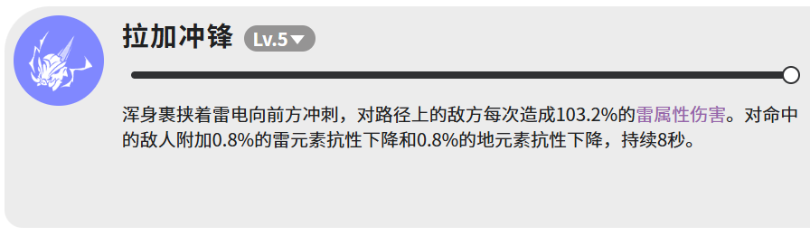 技能体系共含四项,功能分工明确,协同逻辑清晰。首技【拉加冲锋】(等级5)为直线突进型雷属性技能,对路径内目标造成103.2%攻击力的雷属性伤害,并在命中后为敌方施加持续8秒的元素抗性削弱效果——雷抗与地抗各降低0.8%,可多段叠加,为后续技能创造增伤条件。