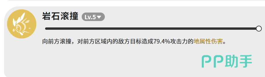 三技【岩石滚撞】(等级5)为前向位移型地属性技能,造成79.4%攻击力的地属性伤害,覆盖前方扇形区域。虽基础倍率低于其他技能,但承担着稳定地属性输出、衔接位移节奏及补充范围压制的作用,是双属性协同机制的重要支点。