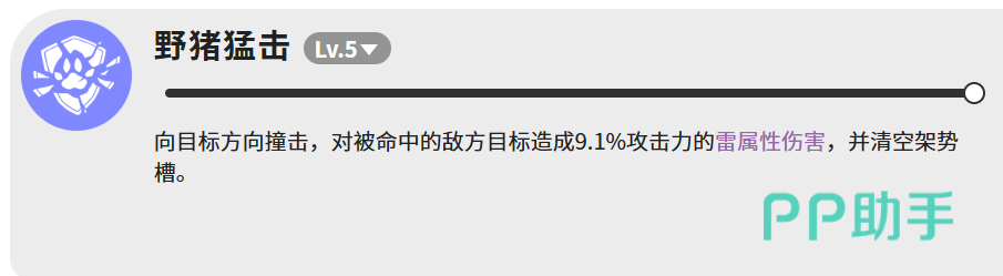 四技【野猪猛击】(等级5)为低伤害高功能型雷属性技能,仅造成9.1%攻击力的雷属性伤害,但具备强制清空敌人架势槽的核心机制。成功命中后可触发硬直状态,为连招衔接、安全输出或战术重置提供关键窗口,定位为体系中的战术控制节点。