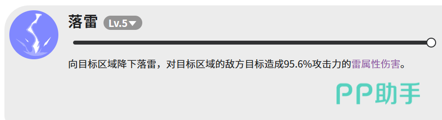 二技【落雷】(等级5)为范围打击型雷属性技能,造成95.6%攻击力的雷属性伤害,作用于指定区域。该技能与拉加冲锋存在显著配合空间:前者完成抗性压制后,后者可实现更高倍率的实际伤害转化,是核心输出循环的关键一环。