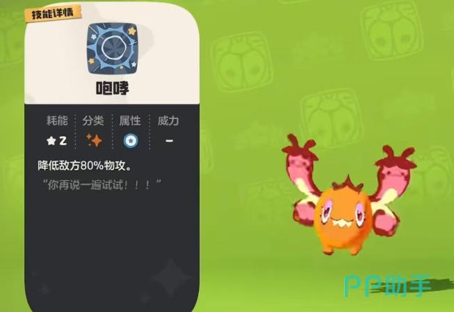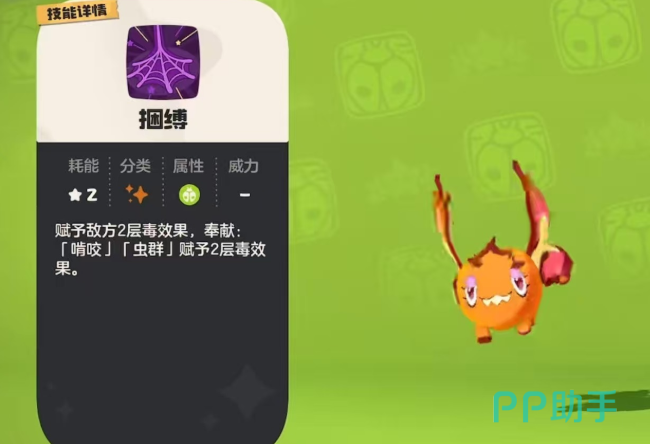 在这套技能搭配中啃咬能给敌人造成物理伤害,而且还有2层中毒的效果示弱可以直接让自身萌太化,速度将会100%的提高,敌人的物攻和魔攻都会受到影响降低50%,捆缚的作用和啃咬是一样的,咆哮主要用来降低敌人80%的物攻。